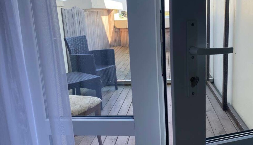 Однокомнатный люкс с террасой. В номере: 2-спальная кровать, набор мягкой мебели, зеркало, телевизор, холодильник, телефон, стол, набор посуды, чайник, стулья.