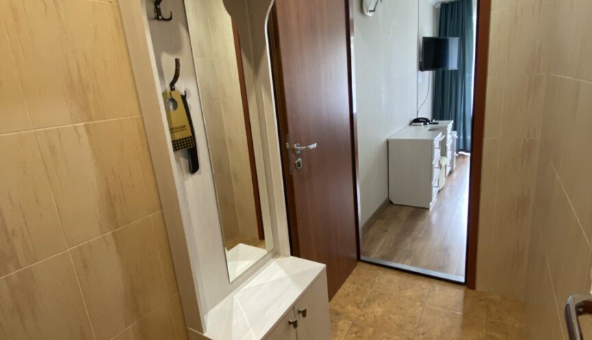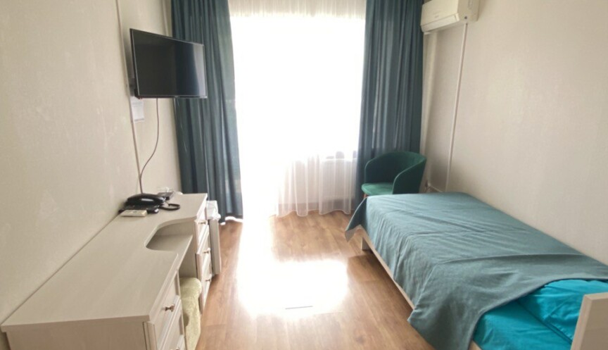 Однокомнатный номер для комфортного размещения одного человека. В номере 1-спальная кровать, шкаф, тумбочка, зеркало, стул, телевизор, холодильник, набор посуды, чайник.
